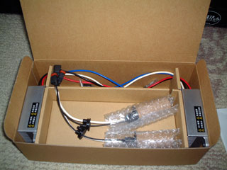 まず、HIDユニットを購入しました。PASSATはH7のタイプです。88HOUSE製の4500Kのものを通販で買いました。\34,800+TAXでした。写真はパッケージを開いたところです。基本的にはセット内容のものだけで足りましたが、バラスト固定用のステーを全部で4本使いました。家にあったものを使いました。