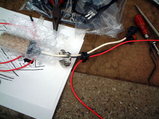 写真はありませんが、バーナーをヘッドライトユニットに組み込む前に一度点灯テストを行いました。写真はユニットに組み込んでのテストです。黄丸はバラストです。まだ明るい時間だったので点灯しましたがあまり分かりませんね。