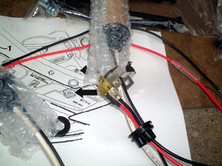 配線加工に取り掛かります。購入したHIDのバーナーには防水ゴムキャップがついています。初めはバラストからのハーネスが2本分通っていますが、純正のスイッチから電源を取るために、写真の用に加工しました。ちなみに固定するための金具は元々ついているものを使います。先述の通りハロゲンバルブよりも台座が厚い分金具を止めにくくなるので、少し曲げて止め易くしました。