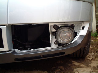 自分でグリルをはずせないかと、フォグランプカバーのあたりから手を突っ込もうと思ってカバーをはずしたところです(結局無理でしたが)。結構固かったです。