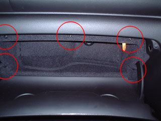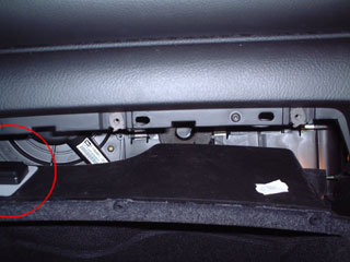 左写真の赤丸部分にネジがあります。下にも2箇所あります。ここをはずすと、グローブボックスが動きます。右写真がグローブボックスをずらしたところです。赤丸はGPSアンテナです。この状態で奥にケーブルを押し込む隙間ができるので、ケーブルをしまいます。