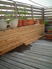 奥行きは約45cm取りました。座るには十分、寝転がっても落ちないくらいのスペースが出来ました。幅も約3mあるので、屋上から見られる花火鑑賞時には役に立つと思います。