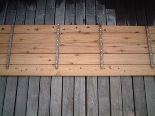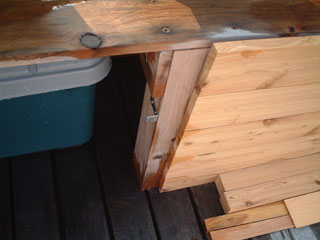 一番悩んだベンチへの固定方法は、脚側に取り付けたL字金具(右写真)に前板の裏につけた金具(吊金具・左写真)を引っ掛ける作戦にしました。さすがに1500mm×450mmくらいのサイズになると、サイプレスなので重いので蝶番は無理(というか、挟み込みなどがあると危険)なので、この方法がベストと考えました。見た目は上々です。