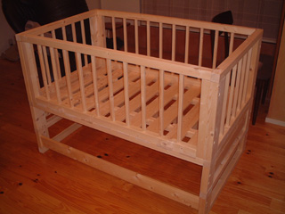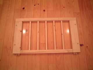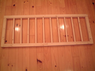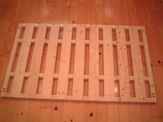 組上げた各部品です。それぞれの部品は、あらかじめ加工しておいたほぞにボンドを流して組んだだけのものです。 左上から、すのこ、頭/足の面の格子部、横の面の格子部、脚の部品です。(2005/10/08記)