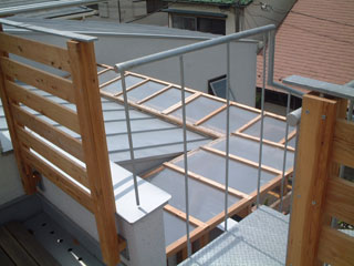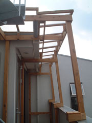 パーゴラに屋根を乗せたところです。左写真が下から、右写真は上から撮ったものです。