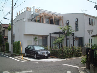 最後に、作成したウッドデッキ&パーゴラを道路から撮ってました。これでたぶん、完成です。(2004/7/23記)