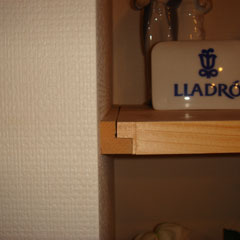 材料はだいぶ前に格安で手に入れたパイン集製材にしました。右の写真の通り、L字の受けを用意してこれを壁にビス止め、棚板も両サイドを欠き落として、載せるだけという構造にしてあります。今回の加工はベビーベッドの作成のときに使わせていただいた木工所で行いました。