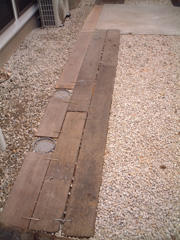 北側にある駐車場は、縦列2台の駐車スペースがあります。ちょうどタイヤの乗る位置に枕木が敷いてあるのですが、奥側は手前よりも1本枕木の数が少なく、左右それぞれ2列ずつ敷いてあります。左右の幅は1,800mmで、左右のタイヤがちゃんと乗るための幅にはほとんどマージンがないので、手前側と同じく左側だけもう1列敷くことにしました。