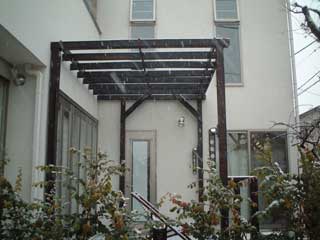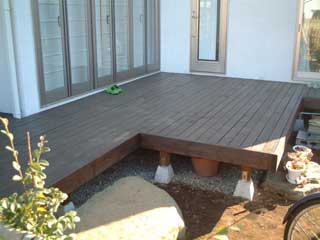組み立て中の写真は無いのですが、基礎は2×4用のブロックを土の地面に直に置いただけ。既存デッキにコーススレッドで固定というかなり適当なものですが、材木自体が相当重いので大分安定しています。