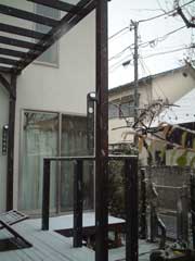 あまり必要ではないのですがデッキの端に沿って一部フェンスもつけました。これは布団が干せるだけの高さを確保することだけ注意して、あとはまた適当です。フェンスのポストは、両端は基礎に載せて、中央はつっかえ棒代わりに簡単に固定しました(下側はシンプソン金具で、上はフェンスのビームの上からコーススレッドで止めました)。