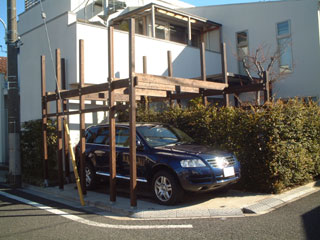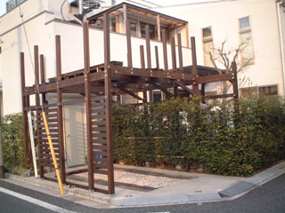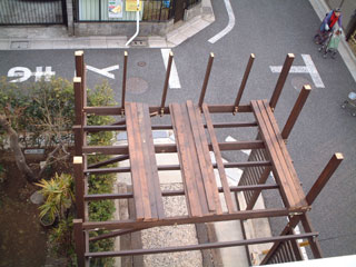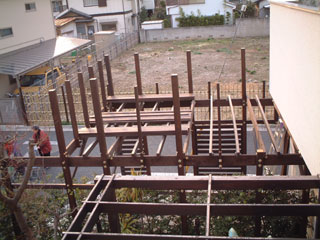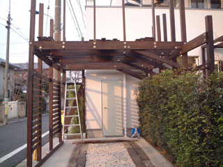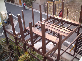 つっかえ棒代わりに他で使用する為に用意してあった材木でポストを支えながら、まず道側のポストをすべて立てました。そして、ビーム兼根太の材(40×175)を庭側まで渡してそこにもポストを立て・・・という具合で写真のように組上げましたが、想像通り大変でした。
