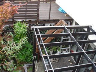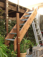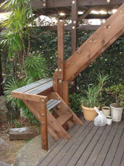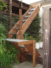 まだ作業中のため、わかりにくい状態ではありますが、WRCの2×10材を側板に、折り返しタイプの階段とします。側板はデッキ本体のポストにボルトで締め付けています。ステップは有効面190mm幅のグレーチングを使用しています。一般的なサイズだと思いますが、長さが995mmあるものをグラインダーで切断して、435mmの長さにして使用しています。若干狭いとは思いますが、下から見上げたときの階段の圧迫感をできるだけ減らしたいことがあったので、上記の長さにしています。(2007/12/02記)