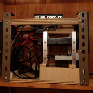 そんなこんなで出来上がりは予定していた機能が乗りましたが、見てくれは大分ヒドイものです。家に転がっていた金具と木でフレームを作って中に押し込んだ感じです。NUCである必要性が全くない大きさになりました。